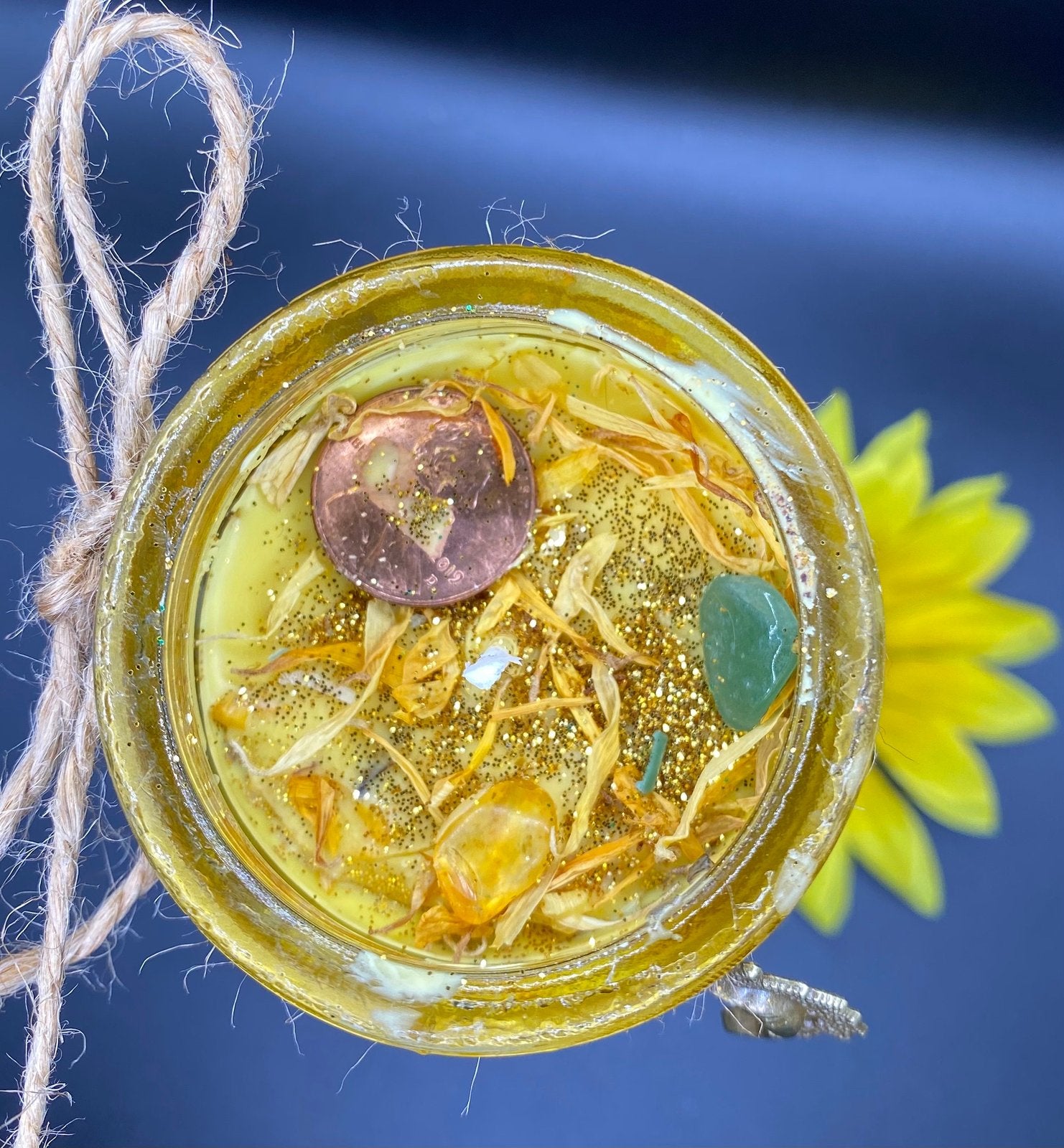 Each candle is individually handmade, charged, and blessed with focused intention. Infused with crystals, herbs, and flowers known for their wealth-drawing and good fortune properties, this lightly scented candle radiates high-vibration energy to help you manifest your goals and step into your power.